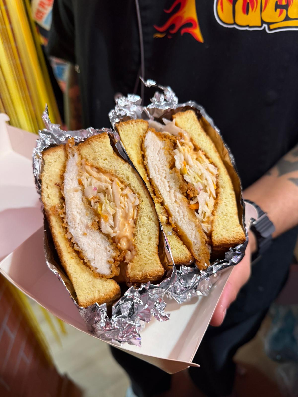 Pane Sando Giapponese, croccantissimi tender di pollo, insalata coleslaw, smoked Tiki sauce.